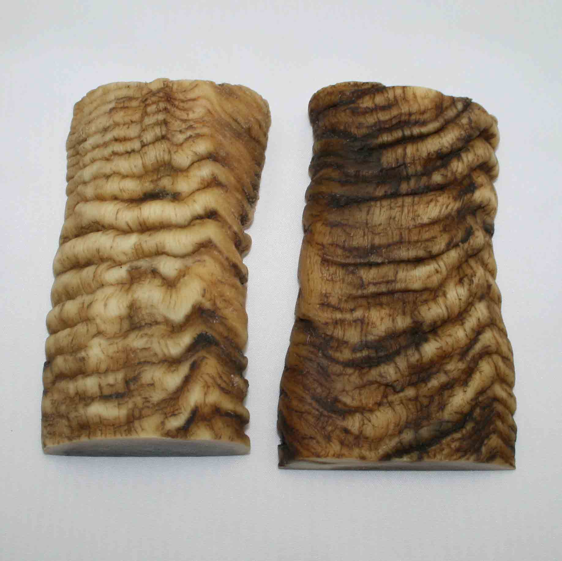 Genuine Merino Ram's Horn. Each set is different with unique coloring, texture and ridge patterns. Sets are matched as cut but may still show variations in texture and color as this is a natural product with no artificial dyes or resins. Sold by average width of the overall set. Shapes may vary and some pieces will have "bend" down the length.