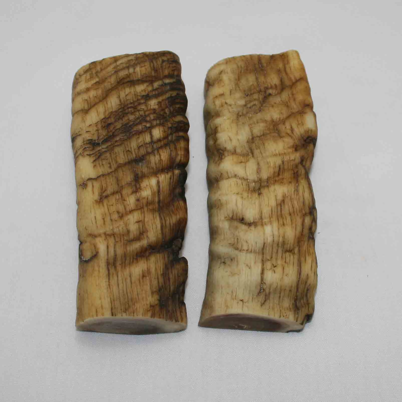 Genuine Merino Ram's Horn. Each set is different with unique coloring, texture and ridge patterns. Sets are matched as cut but may still show variations in texture and color as this is a natural product with no artificial dyes or resins. Sold by average width of the overall set. Shapes may vary and some pieces will have "bend" down the length.