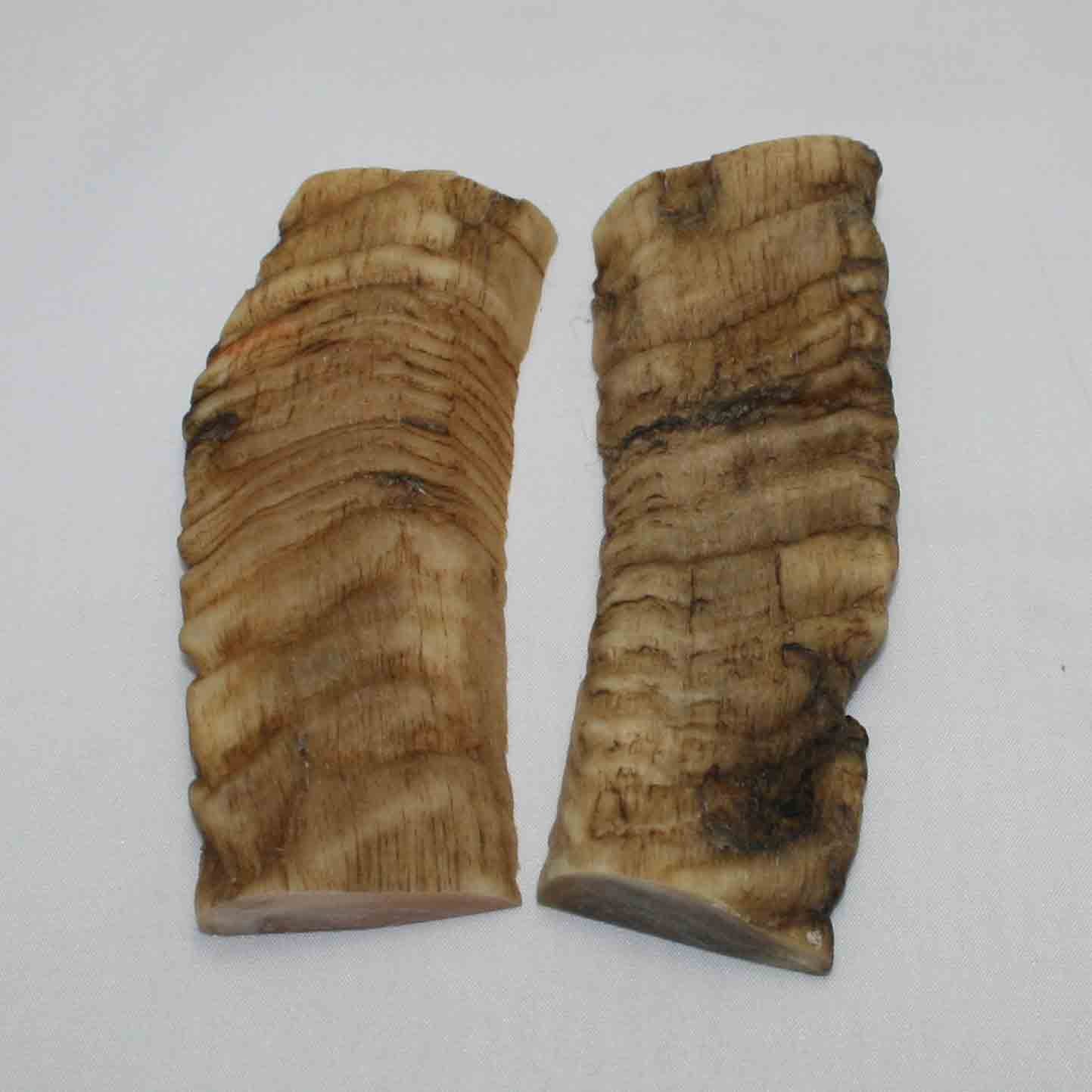 Genuine Merino Ram's Horn. Each set is different with unique coloring, texture and ridge patterns. Sets are matched as cut but may still show variations in texture and color as this is a natural product with no artificial dyes or resins. Sold by average width of the overall set. Shapes may vary and some pieces will have "bend" down the length.