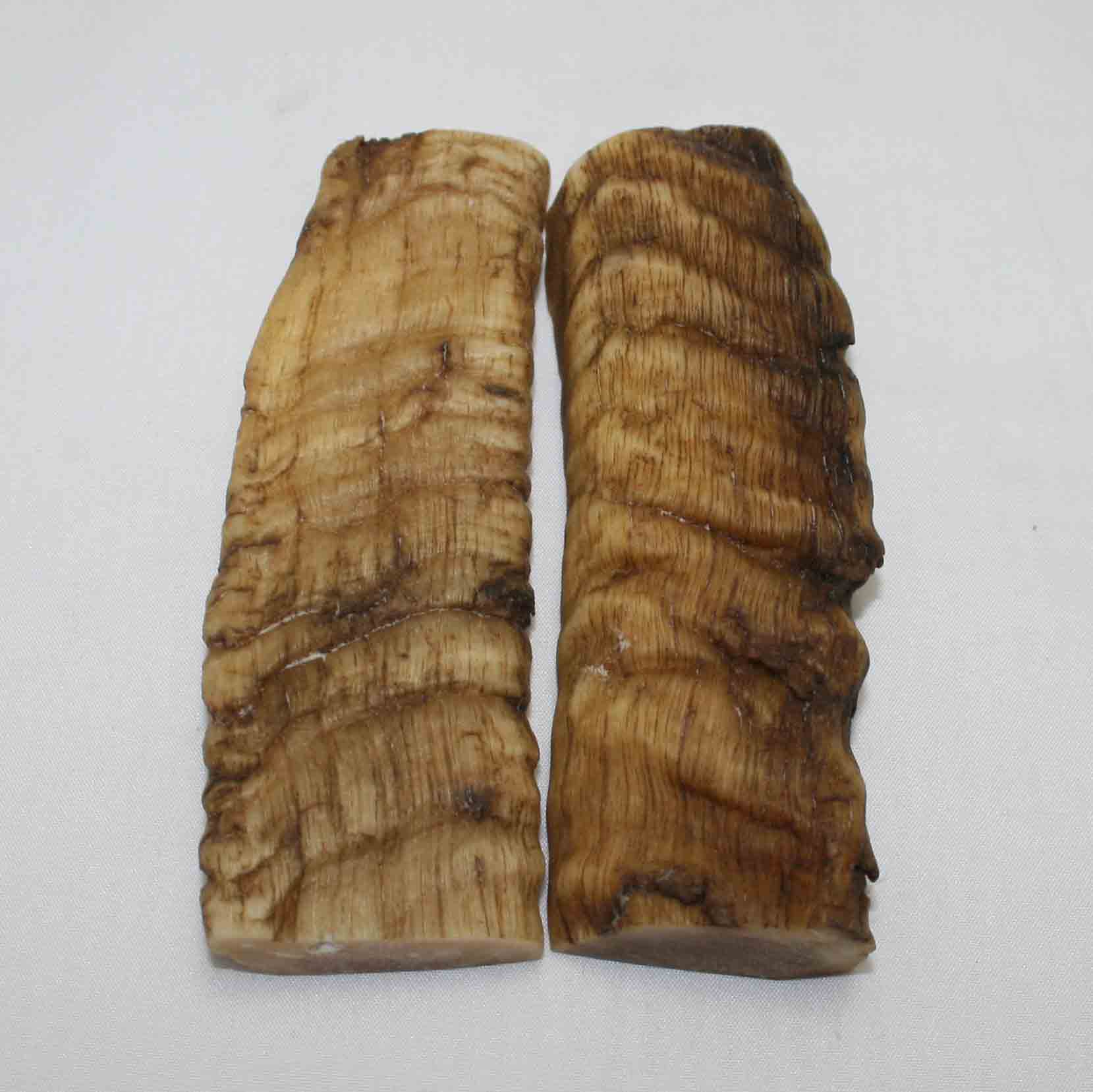 Genuine Merino Ram's Horn. Each set is different with unique coloring, texture and ridge patterns. Sets are matched as cut but may still show variations in texture and color as this is a natural product with no artificial dyes or resins. Sold by average width of the overall set. Shapes may vary and some pieces will have "bend" down the length.