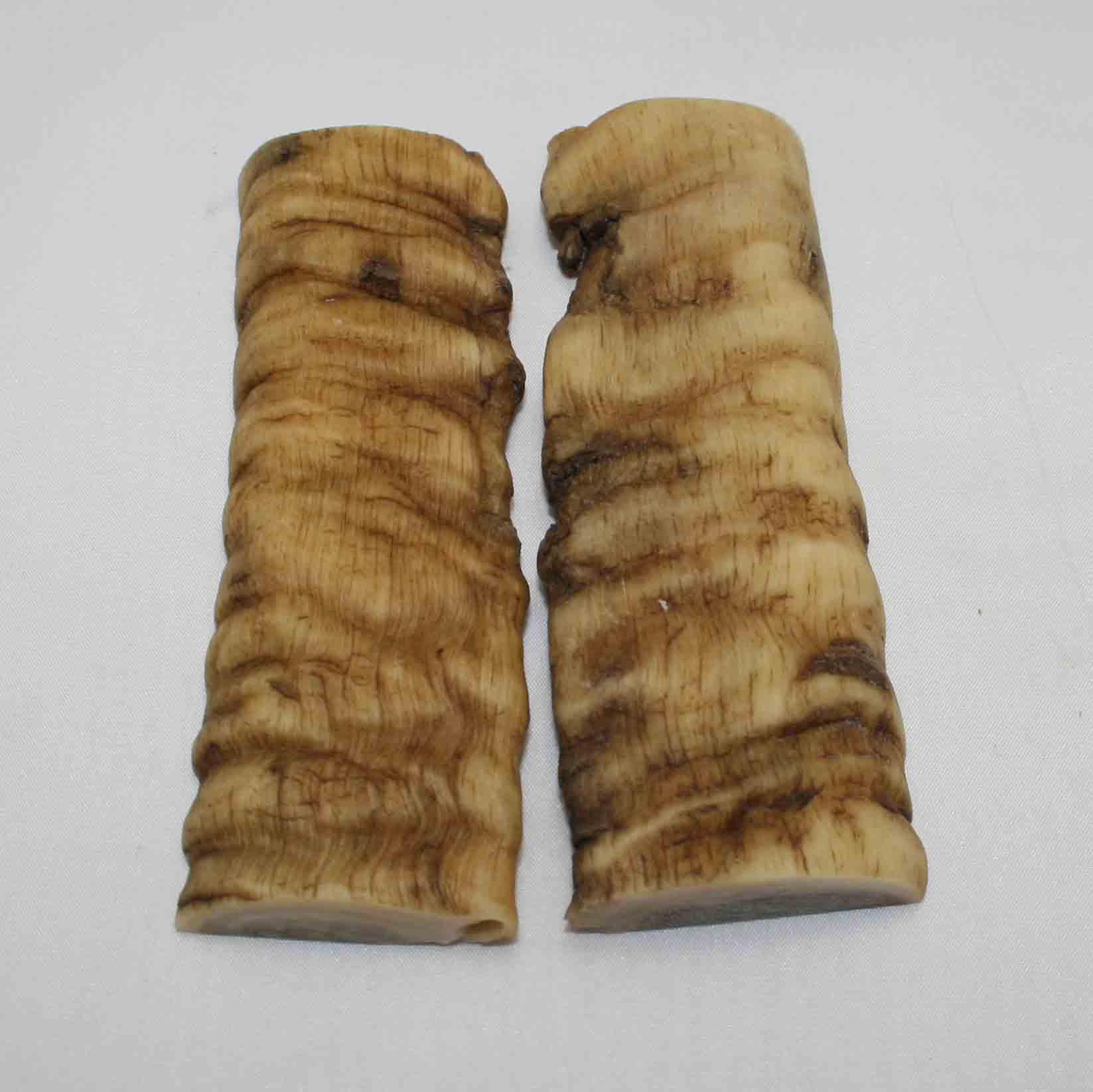 Genuine Merino Ram's Horn. Each set is different with unique coloring, texture and ridge patterns. Sets are matched as cut but may still show variations in texture and color as this is a natural product with no artificial dyes or resins. Sold by average width of the overall set. Shapes may vary and some pieces will have "bend" down the length.
